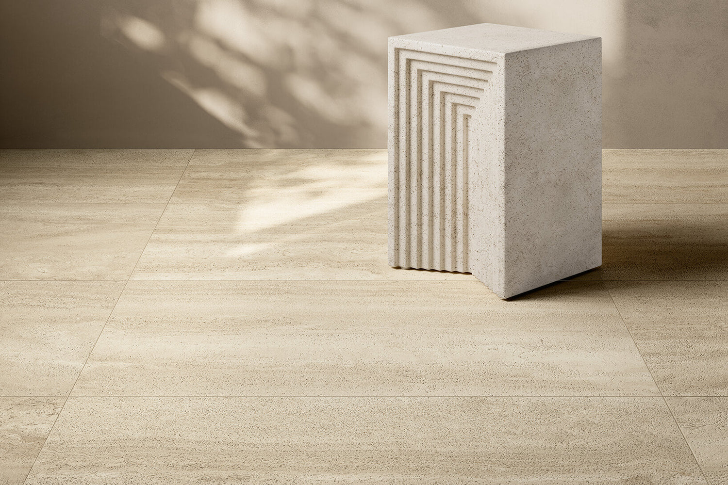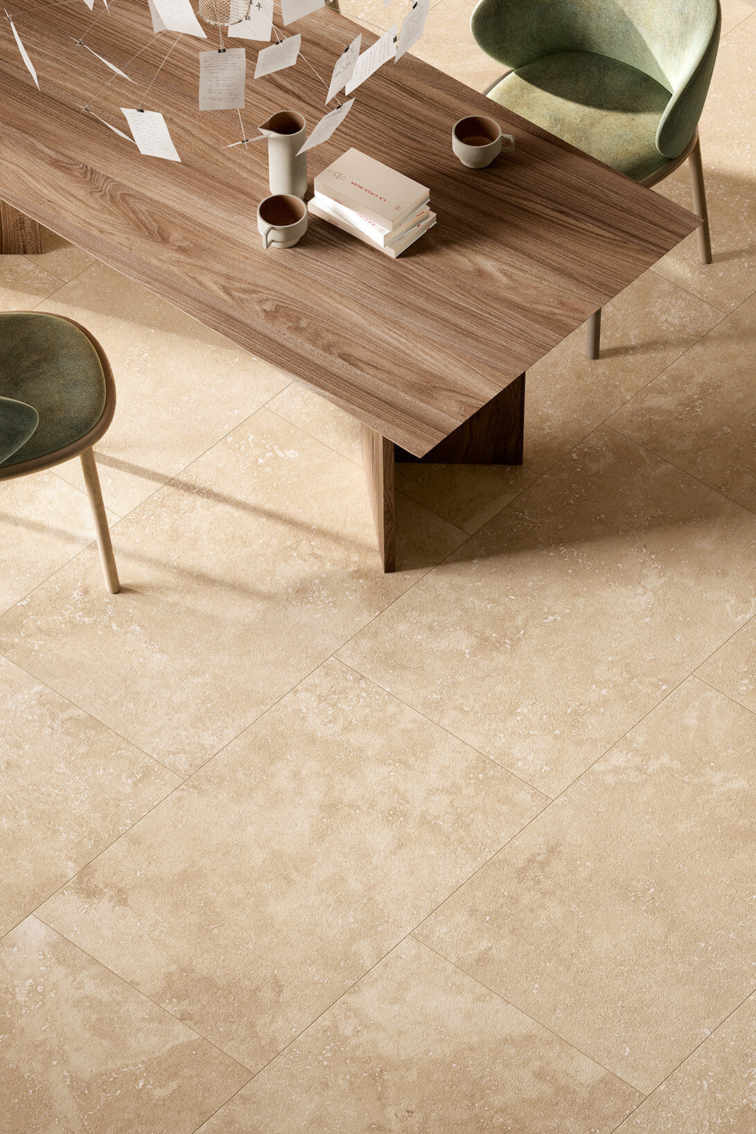 Il gres porcellanato effetto pietra REVERSO interpreta il retro delle lastre in travertino, parzialmente...