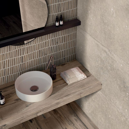 La texture di Nordik Stone si ispira a varietà lapidee sedimentarie, pietre di origine belga e shellstones. La presenza di sottili venature a contrasto, fossili e anticature, ne arricchisce l’aspetto facendone una proposta di gusto rustic-chic, che si sposa con le superfici dal carattere più marcatamente Flaviker, come gli effetti legno, i cementi e i metalli di ispirazione industrial.