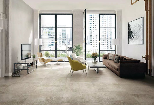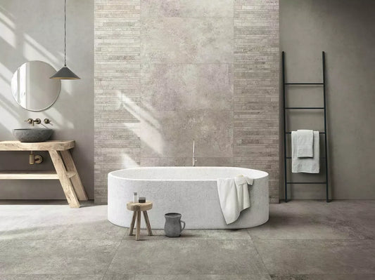Its aesthetic impact, lived and imperfect, expresses a strong naturalness that allows it to harmonize with the wide chromatic proposal, made up of neutral colors and enhanced through shade effects that range from colder tones to warmer ones. The collection is developed in a 9 mm thickness and offers two families of sizes (60x120cm and 80x80cm) with the related sub-sizes which are all modular (of which the 30x60cm is also available in a grip version for outdoors). The shaded graphics of the concrete are available in 6 different neutral shades ranging from white to charcoal, passing through grays and beiges.