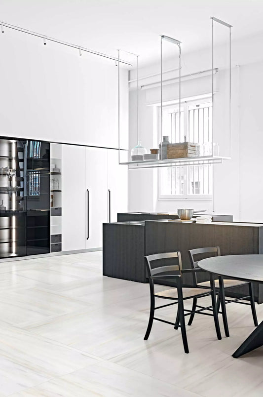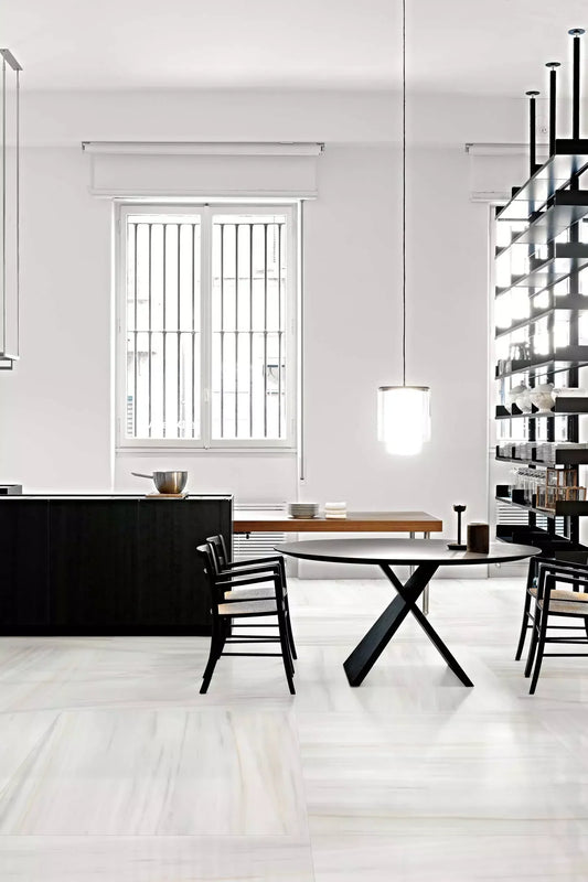 Porcelain stoneware that imitates the look of marble offers a perfect combination of the elegance of natural marble and the advanced technical properties of stoneware. This material stands out for its durability, resistance to water and stains, as well as being easy to clean and maintain. In particular, thick porcelain stoneware is ideal for external flooring, allowing a harmonious transition between the interior and outdoor spaces of the house.