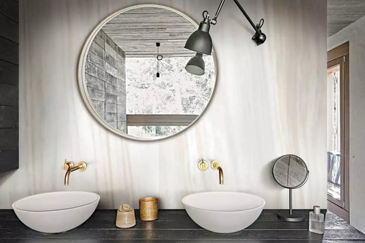 The large porcelain stoneware slabs with a marble effect are particularly suitable for coverings, offering visual continuity between different environments such as the bathroom, living room, bedroom and outdoor spaces.