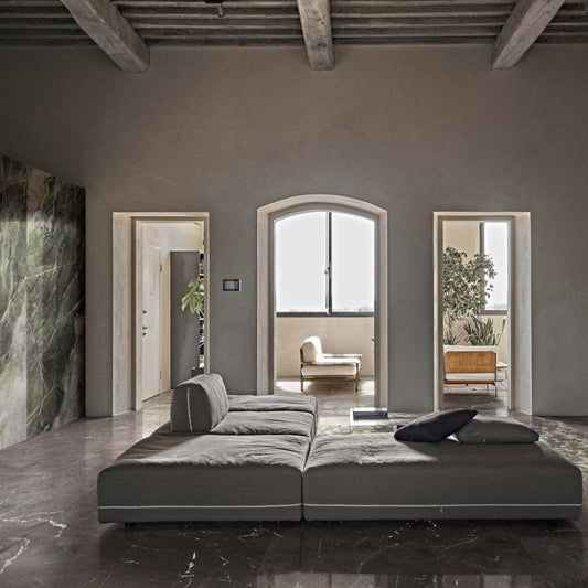 The large porcelain stoneware slabs with a marble effect are particularly suitable for coverings, offering visual continuity between different environments such as the bathroom, living room, bedroom and outdoor spaces.