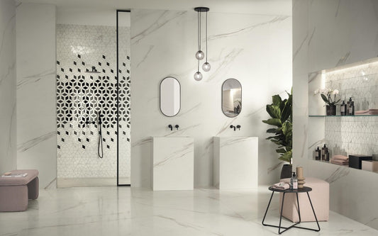 Our "Nobile" tiles are ideal for those looking for an interior design that embraces the elegance of natural marble with the advantages of porcelain stoneware: durability, resistance and simplified maintenance. Whether you are designing a dream bathroom, a luxury kitchen or a living room with an elegant atmosphere, "Nobile" offers versatile and sophisticated solutions to enhance every space.